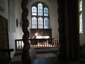 And then there was the tiny timber-framed lychgate, with its four gables and the church beyond. The church was almost entirely built in the late-17th century. Inside, sunlight poured through the mullioned, domestic-looking windows, on to white walls, wooden benches, a screen with barley-sugar-twisted uprights, a communion table, and a font, carved with the initials of the couple, Uvedale and Mary Tomkyns, who paid for the building in 1680. Oil-lamps hung from the plastered ceiling and the brightly painted arms of Charles II (the only brightly coloured object in the place) were displayed on the nave wall. Apart from a gaggle of Calor gas heaters, c 1980, it could almost have been 1680. A bit of hidden England that I shared for half an hour.