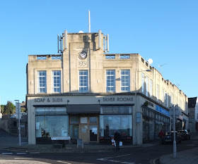 The Cross in Stroud is a road junction at the top end of the High Street that many people must miss. A paved area at the uppermost point of the High Street cuts it off visually, whereas in years gone by traffic must have come up the now pedestrianised street and made its way on and up to Bisley one way or Chalford the other. Now the main landmark here is the old Coop building of 1931, a neat Art Deco design by William Leah with rather pleasantly angular lines, a central clock and a cross-motif in the balustrade that’s repeated in the glazing pattern of the upper parts of the shop windows. With its raised central portion it makes an attractive corner building.